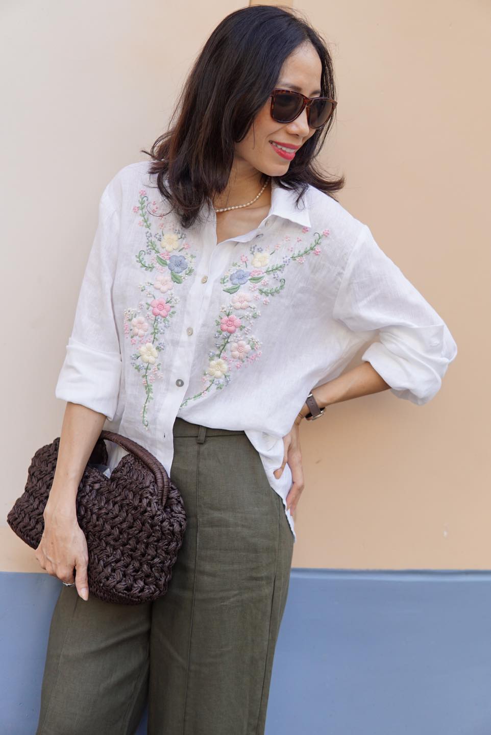 A226 Áo sơ mi linen thêu tay hoa nổi 2 thân MARLEY