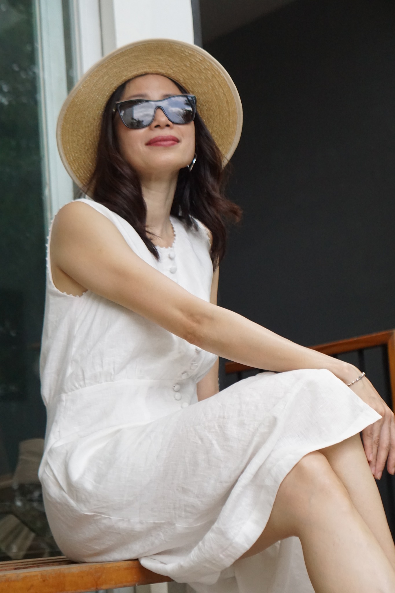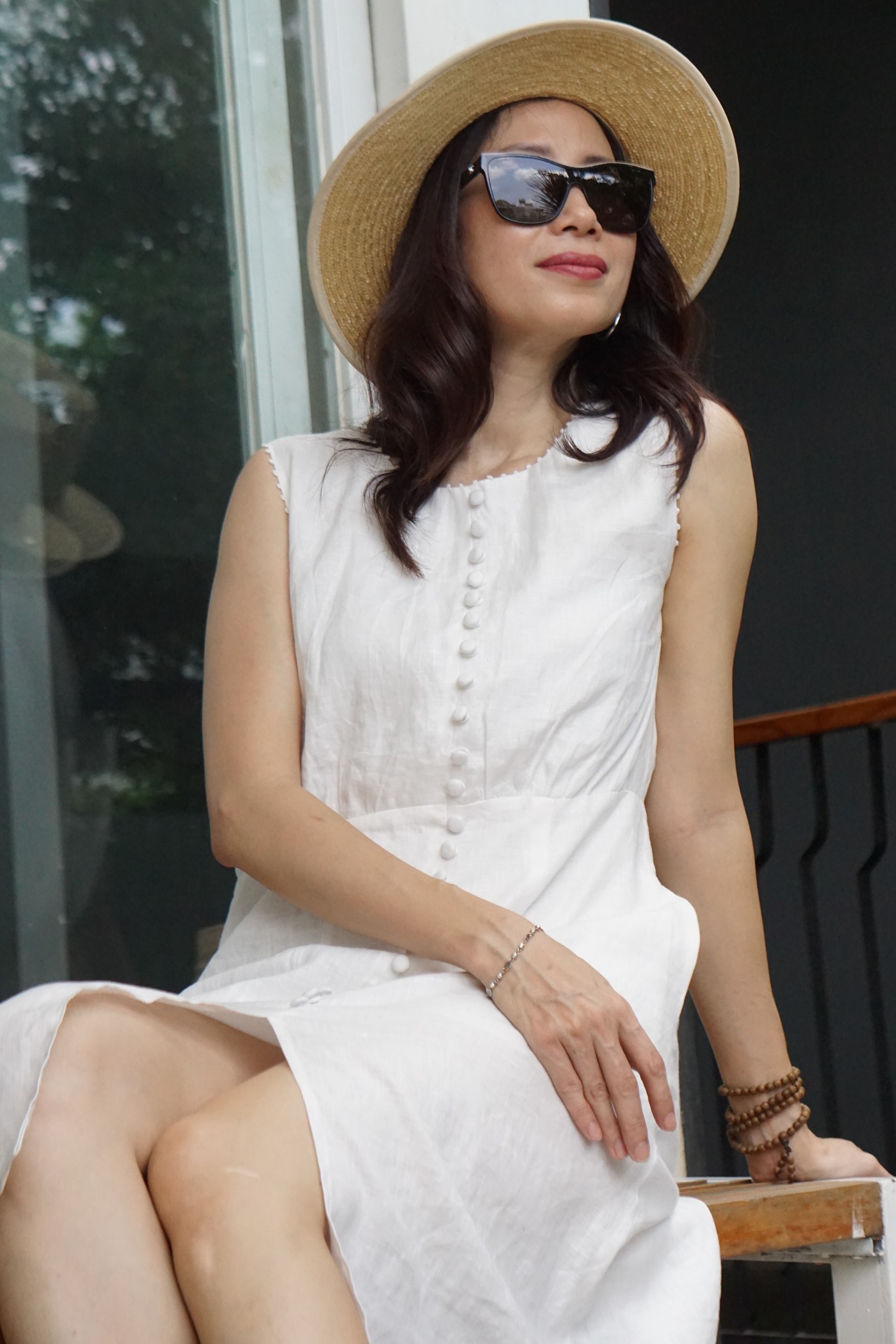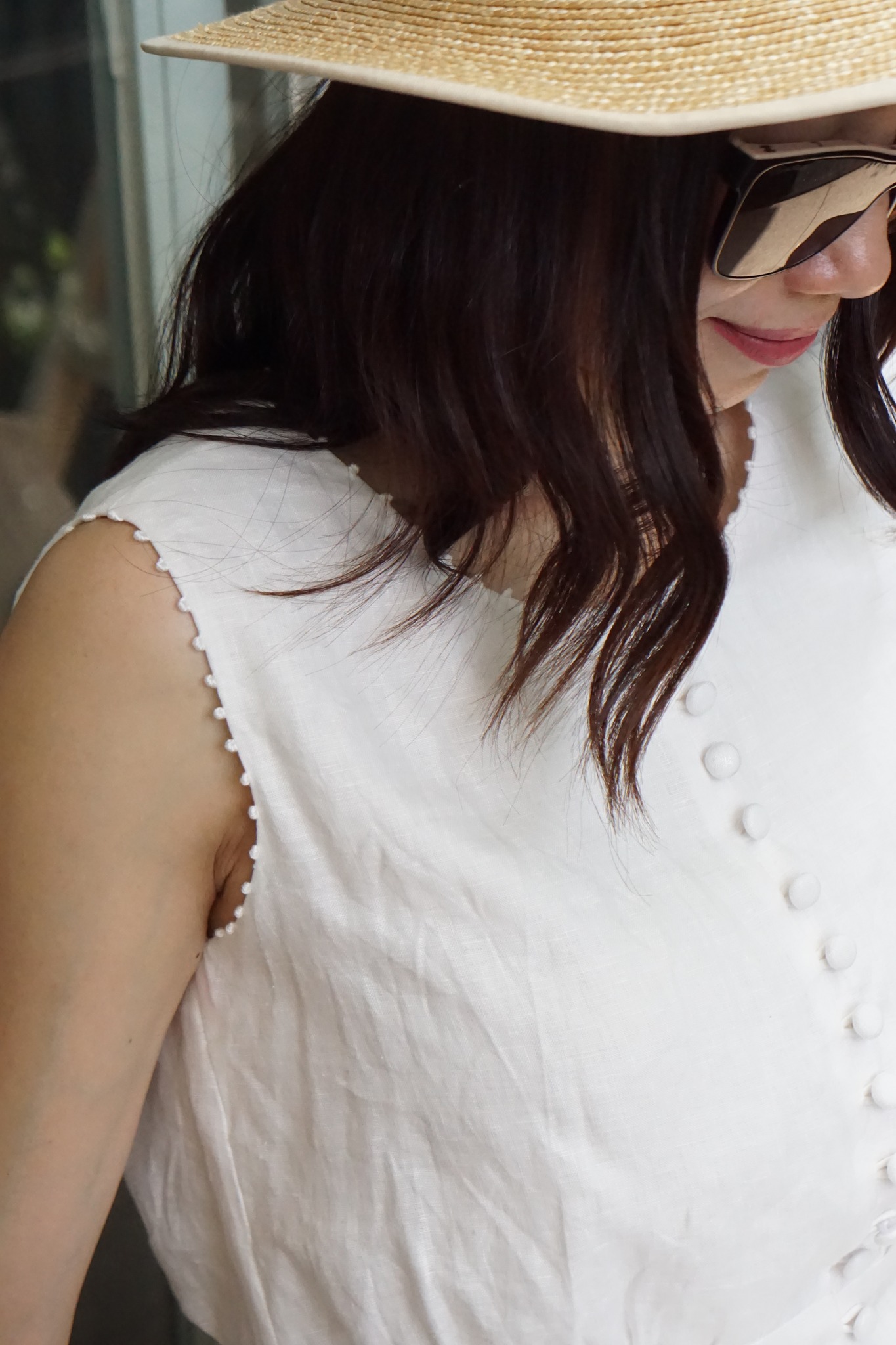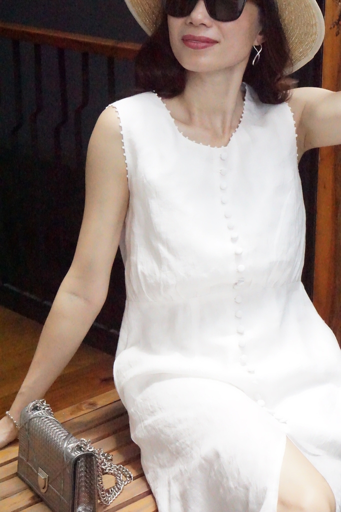 MaxMessi - BLANCHE Đầm Linen nút bọc thêu tay viền