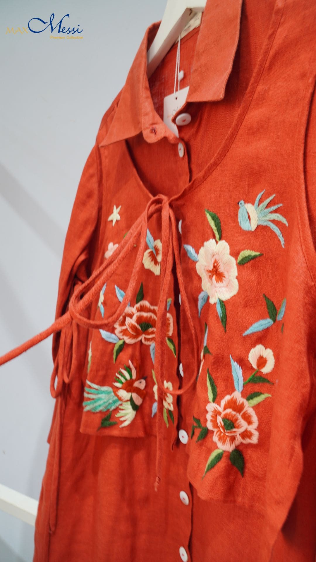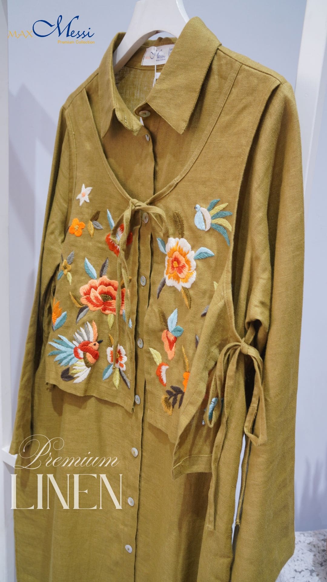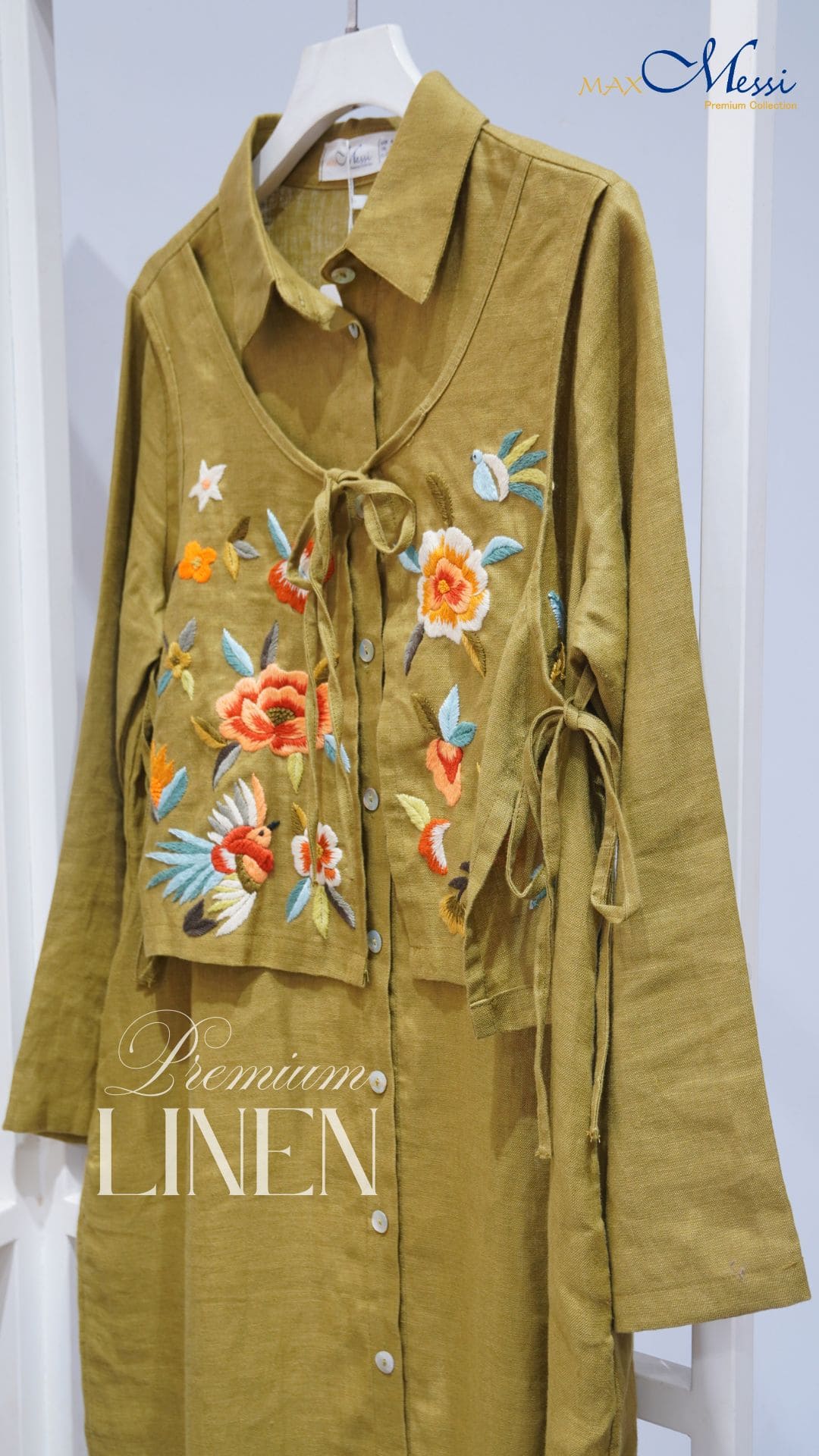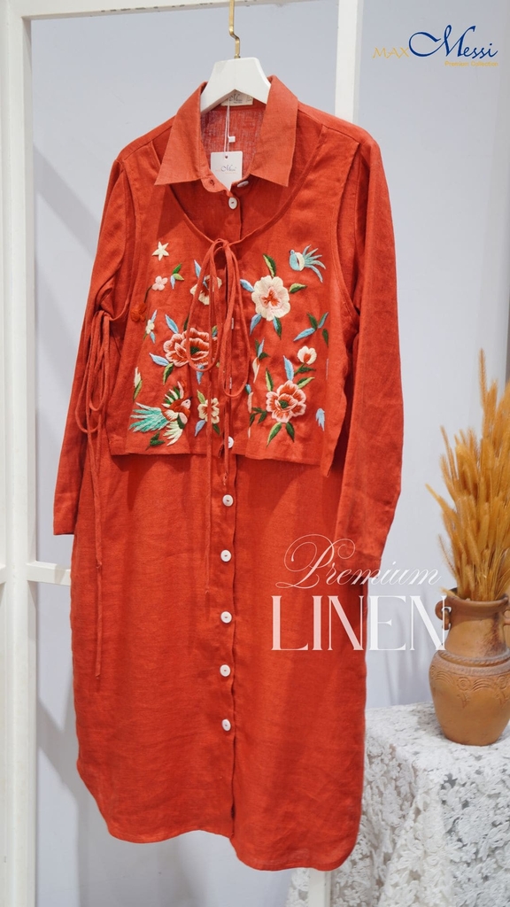 MaxMessi - CARINA Đầm sơ mi linen thêu tay thủ công cột dây