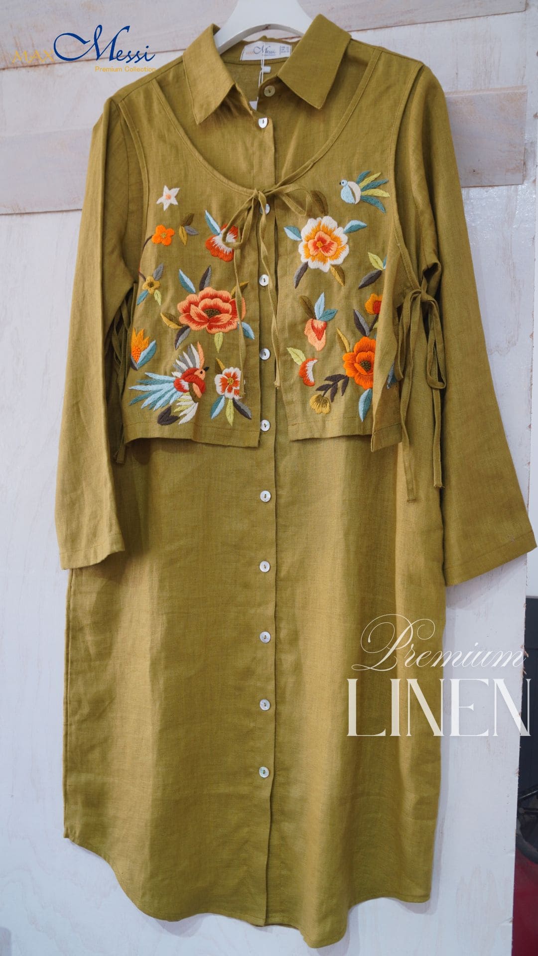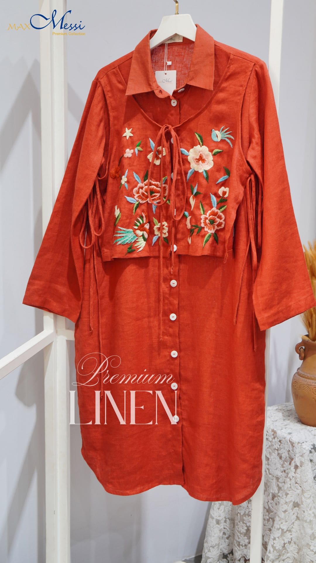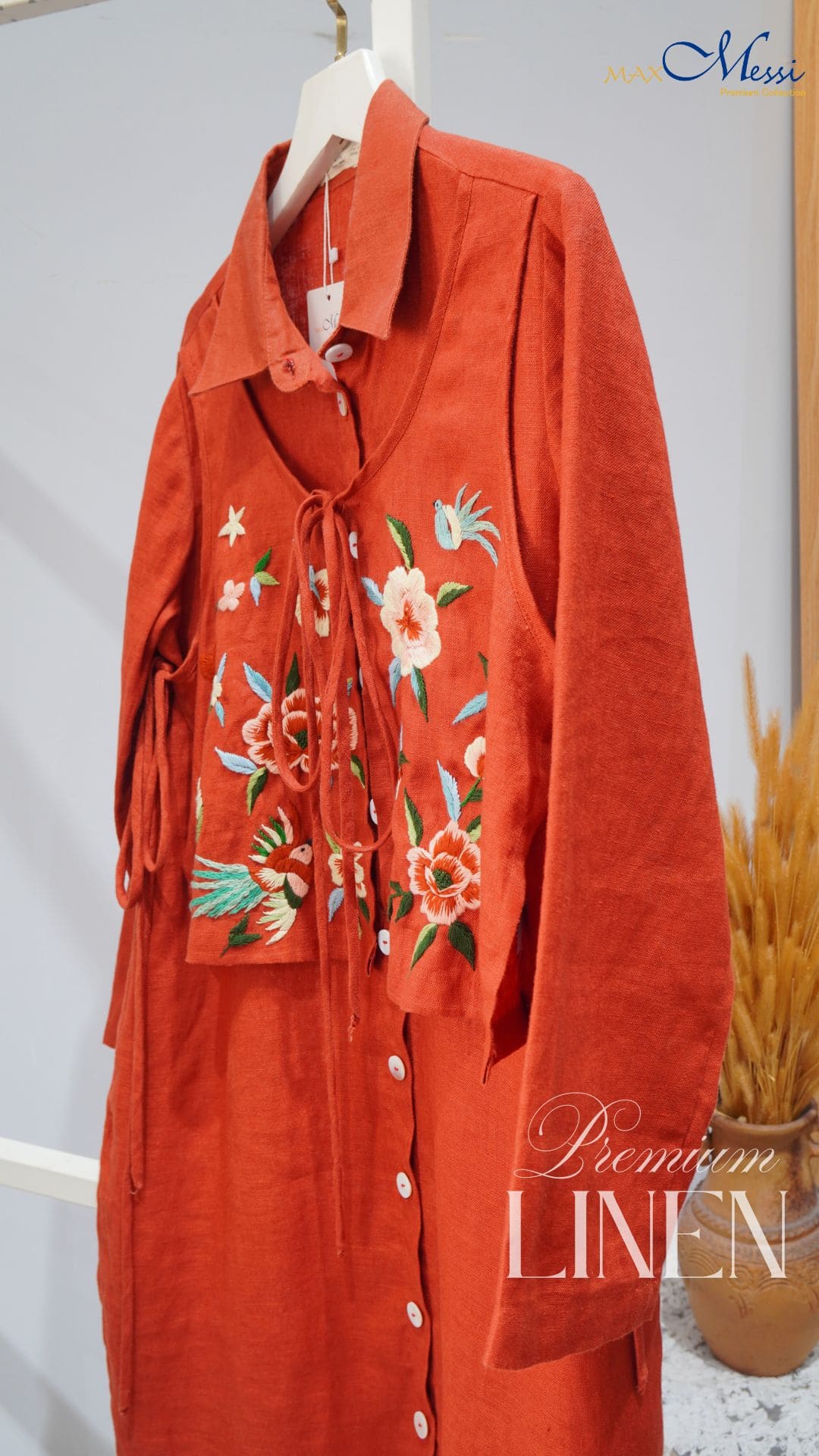 MaxMessi - CARINA Đầm sơ mi linen thêu tay thủ công cột dây