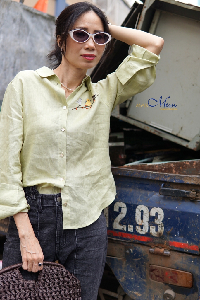Sơ mi linen thêu tay 3 chim non EMMA