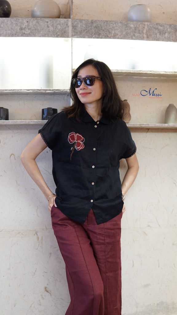 Sơ mi linen thêu tay thủ công hoa 3 lá
